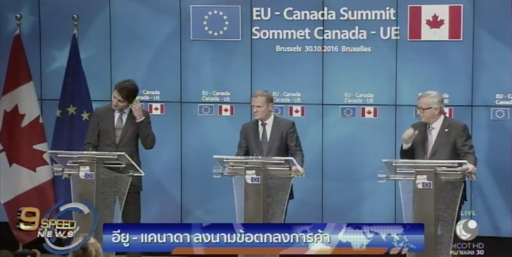 นายกรัฐมนตรีจัสติน ทรูโดของแคนาดา ร่วมลงนามกับนายโดนัลด์ ทัสค์ ประธานคณะมนตรียุโรป และนายฌอง-โคล้ด ยุงเกอร์ ประธานคณะกรรมาธิการยุโรป ในพิธีลงนามการค้าอียู-แคนาดา หรือ “ซีต้า” ซึ่งกำหนดการเดิมมีขึ้นในวันพฤหัสบดีที่กรุงบรัสเซลล์ ประเทศเบลเยียม แต่ต้องล่าช้าออกไป หลังประชาชนกว่า 3.6 ล้านคนในภูมิภาควัลโลเนียของเบลเยียม ไม่เห็นด้วยกับเงื่อนไขดังกล่าว ส่งผลให้รัฐบาลเบลเยียมต้องจัดการความขัดแย้งทางการเมืองภายในประเทศ ก่อนจัดการลงนามให้แคนาดาและอียูในวันนี้.-สำนักข่าวไทย