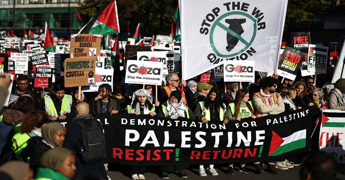 ตำรวจกรุงลอนดอนเกือบ 2,000 นาย รักษาความสงบเรียบร้อยด้วยการแยกผู้ชุมนุม 2 กลุ่มที่มีความเห็นคนละขั้วและเผชิญหน้ากันมาหลายครั้ง ตั้งแต่สงครามอิสราเอล-ฮามาสครั้งใหม่ปะทุขึ้นในวันที่ 7 ตุลาคม การเดินขบวนมีขึ้นแม้ว่ารัฐบาลขอให้ยกเลิก ตำรวจแจ้งว่า จับกุมผู้ชุมนุมประมาณ 150 คนที่ฝ่าฝืนกฎหมายเรื่องห้ามปิดบังใบหน้าและห้ามจุดพลุ และควบคุมตัวผู้ต่อต้านการชุมนุม 82 คนที่พยายามแทรกซึมเข้าไปในขบวนสนับสนุนปาเลสไตน์