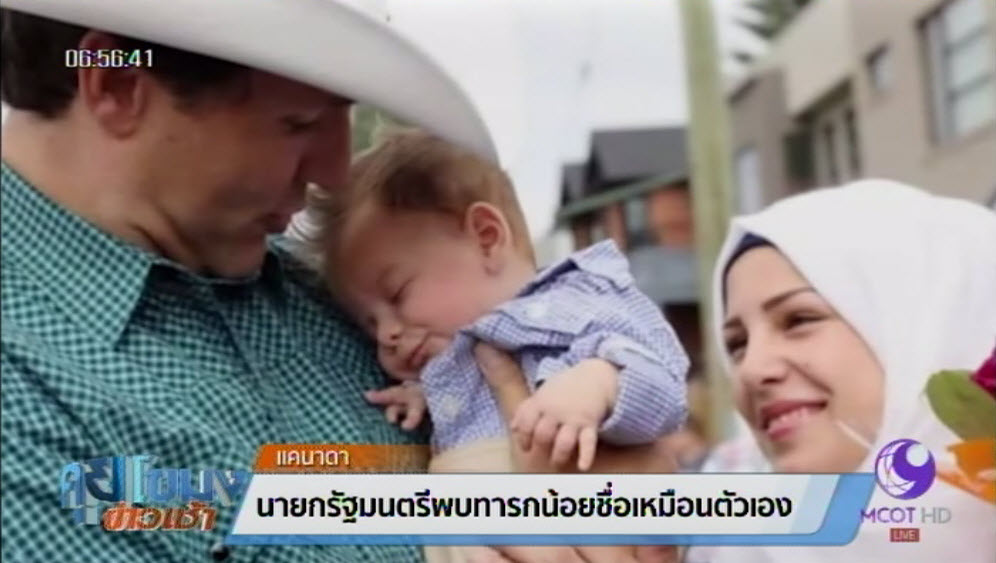 แคนาดา 17 ก.ค. – นายจัสติน ทรูโด นายกรัฐมนตรีแคนาดา พบทารกน้อยผู้มีชื่อว่า “จัสติน ทรูโด” เหมือนกัน ที่พ่อแม่ซึ่งเป็นผู้ลี้ภัยชาวซีเรียตั้งให้ เพื่อเป็นการตอบแทนที่ให้พำนักลี้ภัยในแคนาดา