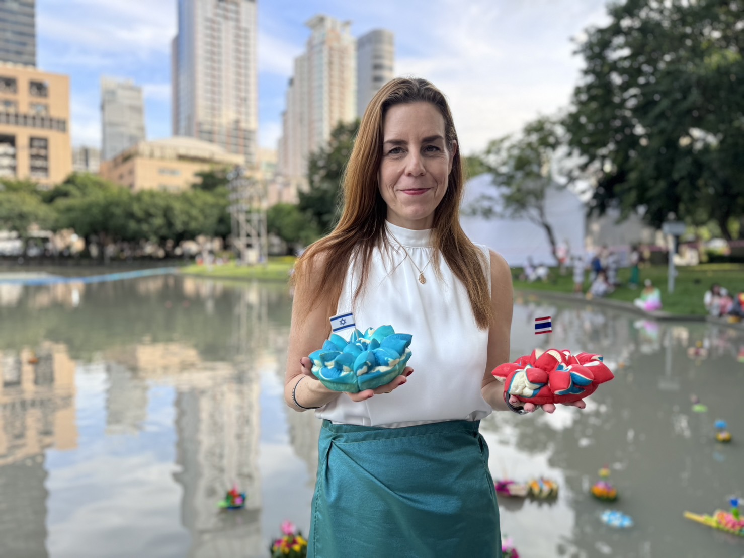 กรุงเทพฯ 27 พ.ย. – นางออร์นา ซากิฟ เอกอัครราชทูตอิสราเอลประจำประเทศไทย ร่วมสืบสานประเพณีไทย ด้วยการลอยกระทง ณ อุทยานเบญจสิริ ร่วมกับคณะสื่อมวลชนในประเทศไทย โดยสถานเอกอัครราชทูตอิสราเอลได้เตรียมกระทงรักษ์โลกที่ทำจากขนมปัง รวม 180 กระทง มีทั้งกระทงที่เป็นสีฟ้า-ขาว ซึ่งเป็นสีของธงชาติอิสราเอล จำนวน 165 กระทง และอีก 15 กระทงเป็นสีธงชาติไทย