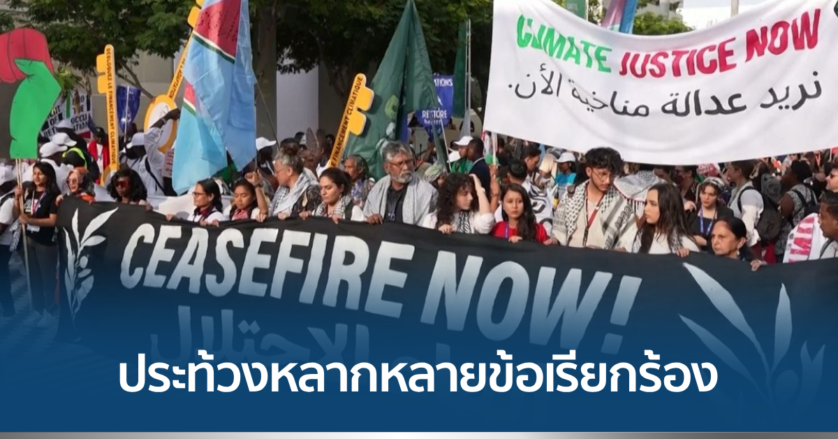 กลุ่มผู้ประท้วงหลากหลายประเด็น ตั้งแต่การเรียกร้องให้มีการหยุดยิงเพื่อมนุษยธรรมในฉนวนกาซา ไปจนถึงสิทธิของกลุ่มชาติพันธุ์ และความยุติธรรมอันเกิดจากปัญหาสภาพอากาศเปลี่ยนแปลง เดินขบวนแสดงพลังบริเวณจัดการประชุมแก้ปัญหาโลกร้อน COP28 ที่นครรัฐดูไบ สหรัฐอาหรับเอมิเรตส์ หรือยูเออี