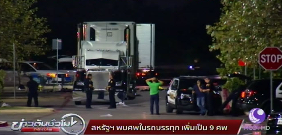สหรัฐ 24 ก.ค. – ความคืบหน้าเหตุพบศพในรถบรรทุกพ่วงที่จอดอยู่บริเวณลานจอดรถห้างสรรพสินค้าในเมืองซานอันโตนิโอ รัฐเทกซัสของสหรัฐ ล่าสุดตำรวจพบศพเพิ่มเป็น 9 ศพ และอีก 30 คน ป่วยจนต้องนำตัวส่งโรงพยาบาล เนื่องจากมีอาการขาดน้ำและลมแดด เพราะภายในรถไม่มีเครื่องปรับอากาศและน้ำดื่ม ตำรวจเชื่อว่า เหตุที่เกิดขึ้นน่าจะเกี่ยวข้องกับแก๊งค้ามนุษย์ และได้จับกุมคนขับรถบรรทุกไปสอบสวน ก่อนจะตั้งข้อหาต่อไป. – สำนักข่าวไทย