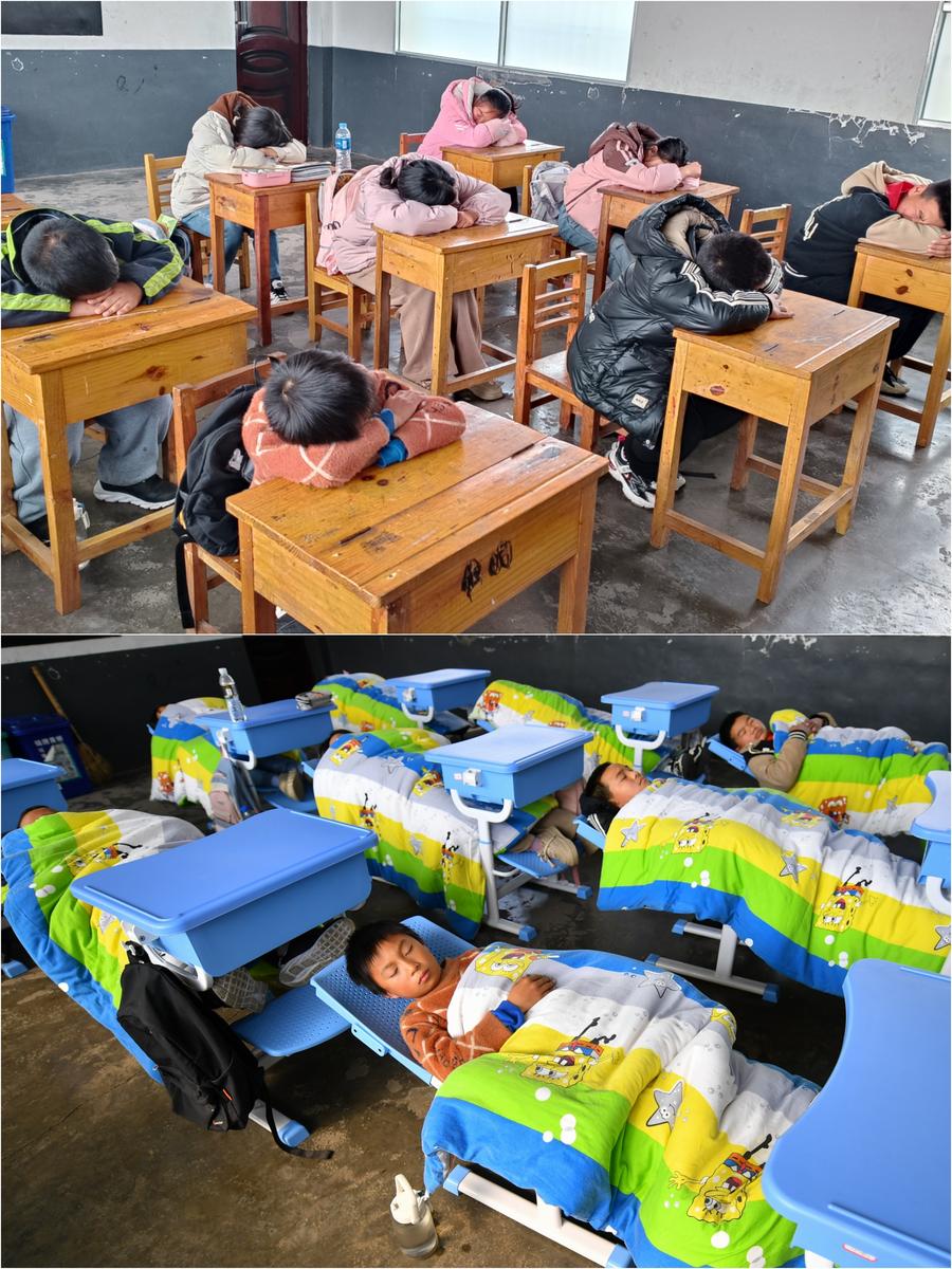 ฉางซา 12 ม.ค. – เด็กนักเรียนชั้นประถมได้งีบหลับช่วงพักเที่ยงบนเก้าอี้พับปรับนอนได้ในห้องเรียนของโรงเรียนประถมแห่งหนึ่งที่อยู่ ในตำบลหลงฝู เมืองหลิวหยาง มณฑลหูหนาน ทางตอนกลางของจีน