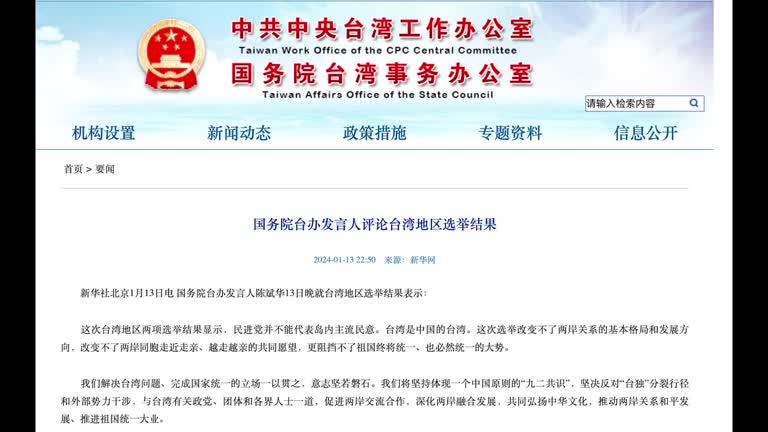 โฆษกสำนักงานกิจการไต้หวันของจีนแถลงเมื่อวานนี้ว่า ชัยชนะของนายไล่ ชิงเต๋อ ประธานพรรคดีพีพีจะไม่เปลี่ยนแปลงภูมิทัศน์พื้นฐานของความสัมพันธ์ข้ามช่องแคบไต้หวัน และผลการเลือกตั้งแสดงให้เห็นว่าพรรคดีพีพีไม่สามารถเป็นตัวแทนกระแสหลักของคนบนเกาะไต้หวัน