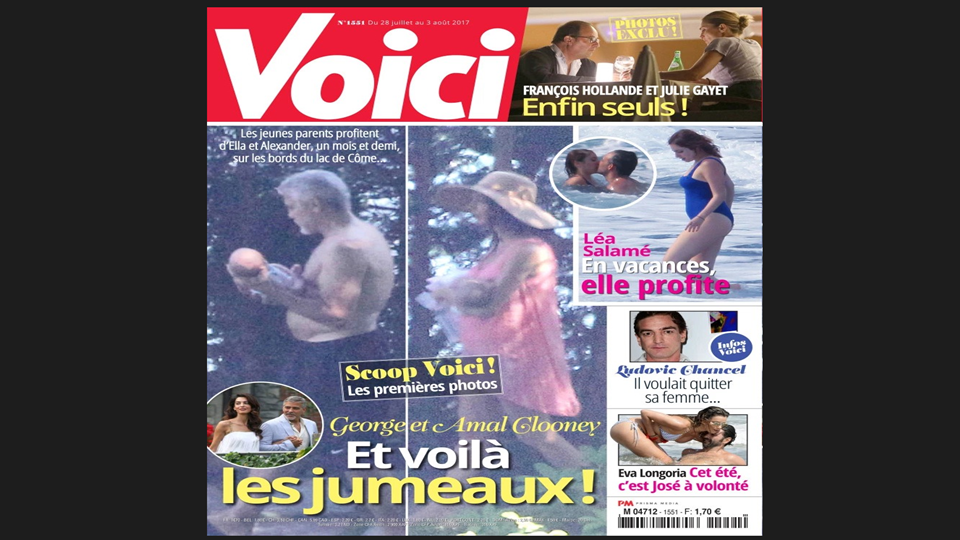 คลูนีย์แถลงว่า ช่วงสุดสัปดาห์ที่แล้ว ช่างภาพกลุ่มหนึ่งของนิตยสารฉบับนี้ปีนรั้วบ้านเข้ามาแล้วปีนขึ้นต้นไม้ ลอบถ่ายภาพลูกแฝดของเขาที่อยู่ภายในบ้าน ดังนั้นเขาจะดำเนินการฟ้องร้องทั้งหมดทั้งช่างภาพ นิตยสาร และเอเจนซีโฆษณาตามที่กฎหมายกำหนดไว้ ทั้งนี้เพื่อความปลอดภัยของลูก ๆ