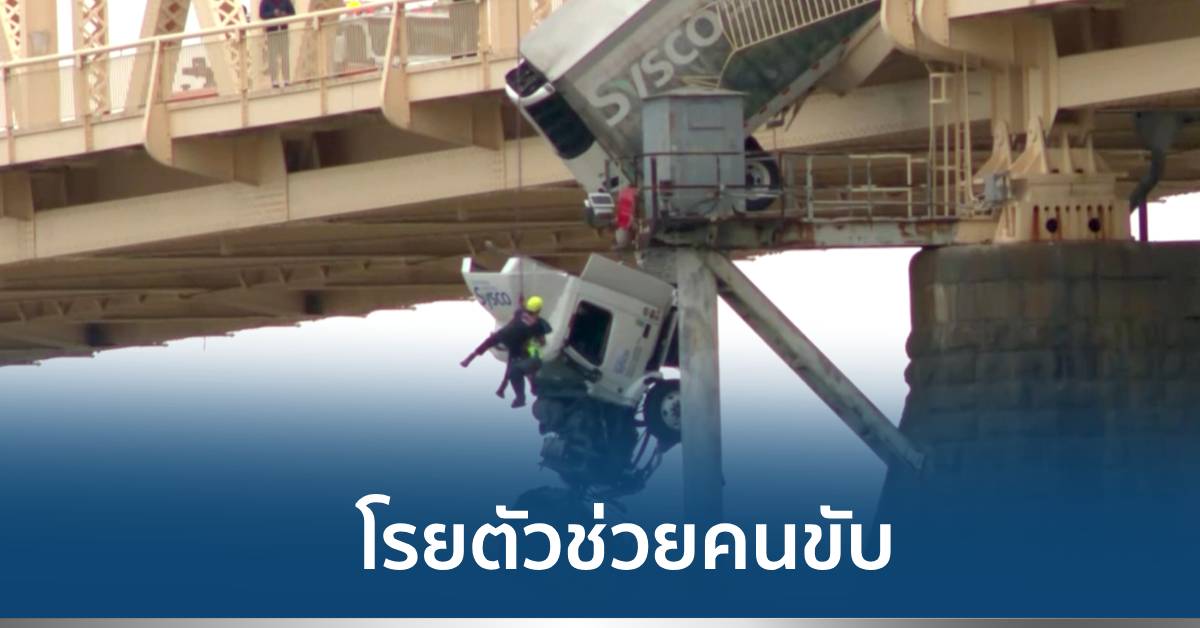 สหรัฐ 2 มี.ค.-สุดหวาดเสียว รถบรรทุกชนทะลุราวสะพาน ตัวรถพาดอยู่บนสะพานครึ่งหนึ่ง ในขณะที่ส่วนหัวของรถห้อยอยู่ด้านล่าง กู้ภัยต้องโรยตัวช่วยคนขับที่ติดอยู่ในห้องโดยสาร ซึ่งห้อยหัวลงไปในน้ำ
