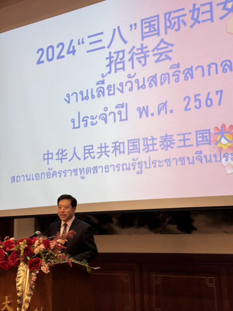 ฯพณฯ หาน จื้อเฉียง กล่าวว่า วันนี้ตนและอัครราชทูตอู๋ จื้ออู่ ได้รับเชิญเป็นตัวแทนของชายชาวจีนจำนวน 720 ล้านคน แสดงความปรารถนาดีต่อสุภาพสตรีทั้งชาวจีนและไทย พร้อมทั้งยกย่องว่าสตรีทั้งจีนและไทยเป็นกลุ่มผู้หญิงที่มีความยิ่งใหญ่และโดดเด่นที่สุดในโลก ทั้งยังเป็นหุ้นส่วนที่ดี มีใจตรงกัน