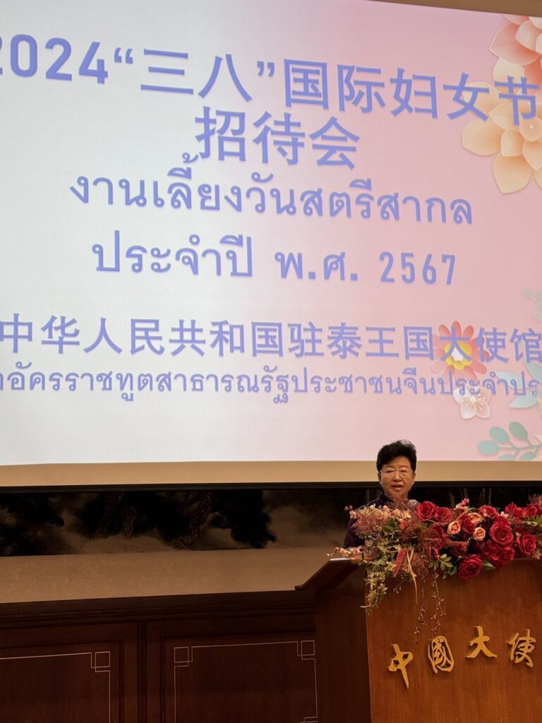 ขณะที่ ศาสตราจารย์หวัง ฮวน ภริยาเอกอัครราชทูตจีน กล่าวยกย่องสตรีทุกคนที่อยู่เบื้องหลังความสำเร็จ พร้อมทั้งระบุว่ากิจการสตรีของจีนและไทยต่างประสบความสำเร็จเชิงประวัติศาสตร์ โดยส่งเสริมกันและกัน และพัฒนาร่วมกันผ่านการแลกเปลี่ยนและความร่วมมือ ทั้งนี้ ยังได้กล่าวถึงประธานาธิบดีสี จิ้นผิง ว่าผู้นำจีนให้ความสำคัญและใส่ใจการพัฒนากิจการสตรี ช่วยขจัดช่องว่างระหว่างเพศด้านการศึกษาภาคบังคับ คุ้มครองสิทธิและประโยชน์ของสตรีให้มีความสมบูรณ์มากยิ่งขึ้น โดยสังคมจีนในปัจจุบันมีสตรีได้รับการจ้างงานมากถึงกว่า 40% ของการจ้างงานในสังคม ขณะเดียวกันกล่าวยกย่องรัฐบาลไทยที่มุ่งมั่นอย่างแข็งขันในการพัฒนาสถานะของสตรี ทั้งนี้ แวดวงสตรีของจีนและไทย ได้แลกเปลี่ยนและความร่วมมืออย่างใกล้ชิดลึกซึ้งมานานกว่า 40 ปี ถือว่ามีคุณูปการต่อความเท่าเทียม การพัฒนา และสันติภาพระดับโลก