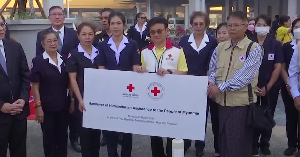 แม่สอด 26 มี.ค.- สภากาชาดไทยส่งมอบความช่วยเหลือด้านมนุษยธรรมแก่ประชาชนเมียนมา ภายใต้ข้อริเริ่มการยกระดับการให้ความช่วยเหลือด้านมนุษยธรรมแก่ประชาชนเมียนมาตามแนวพรมแดน