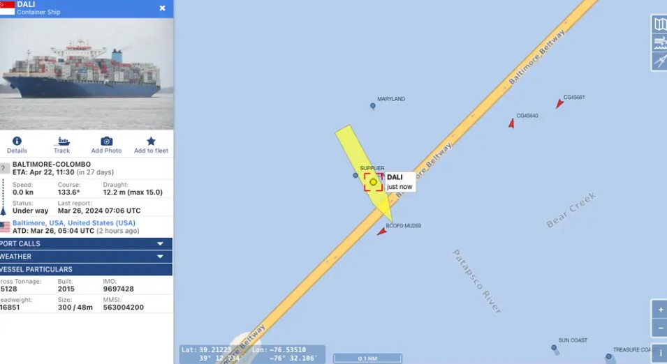 บิสซิเนสส์ อินไซเดอร์ได้ตรวจสอบแผนที่การเดินเรือในเว็บไซต์เวสเซิล ไฟน์เดอร์ (VesselFinder) พบว่า เมื่อเวลา 02:50 น.วันนี้ตามเวลาท้องถิ่น เรือดาลี (Dali) ซึ่งเป็นเรือบรรทุกสินค้าติดธงชาติสิงคโปร์ ยังคงจอดนิ่งอยู่ใต้สะพาน สะพานแห่งนี้เปิดใช้งานเมื่อเดือนมีนาคม 2520 มีความยาวทั้งหมด 2,632.3 เมตร.-814.-สำนักข่าวไทย