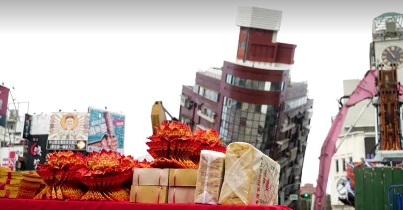 ฮวาเหลียน 5 เม.ย.- กลุ่มคนทำงานจัดเครื่องเซ่นไหว้ในเช้าวันนี้ก่อนที่จะรื้อถอนอาคารหลังหนึ่งในเทศมณฑลฮวาเหลียน ทางตะวันออกของไต้หวันที่เอียงลงมาอย่างน่ากลัวมาตั้งแต่เกิดแผ่นดินไหวขนาดใหญ่เมื่อวันพุธ