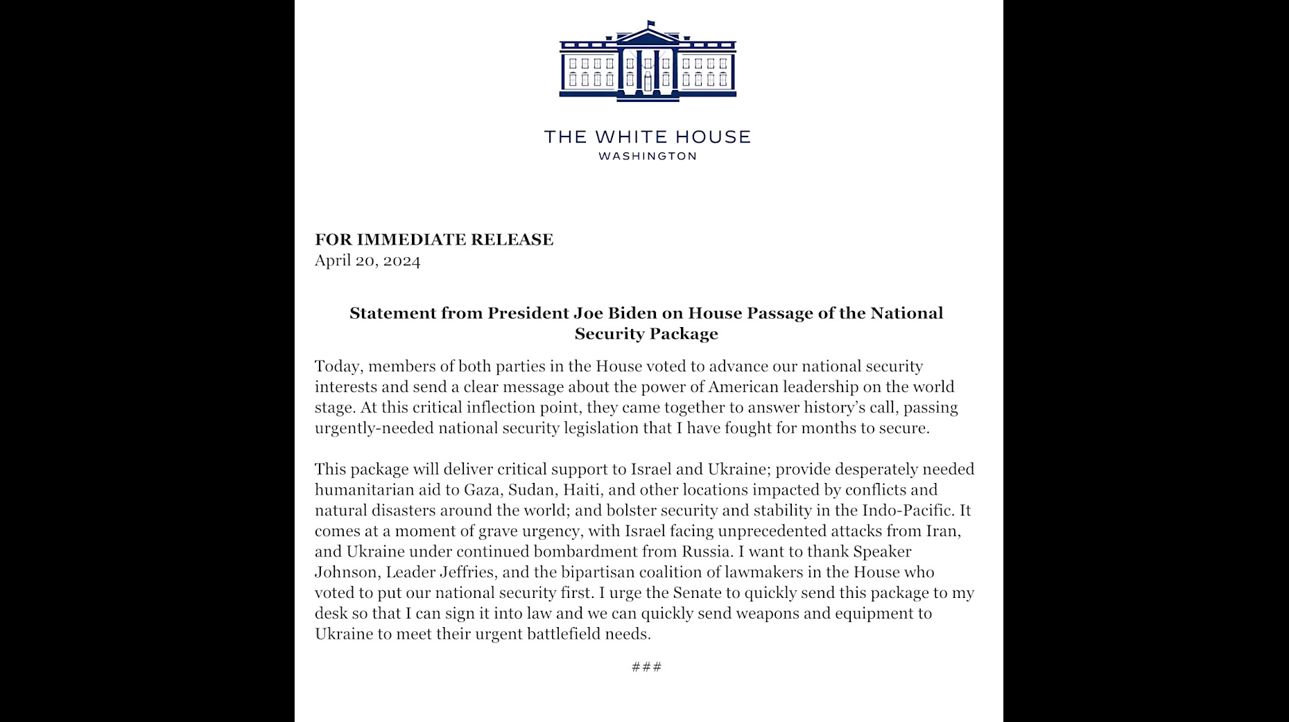 ประธานาธิบดีโจ ไบเดนของสหรัฐ เรียกร้องให้วุฒิสภาสหรัฐ ซึ่งพรรครัฐบาลเดโมแครตครองเสียงข้างมาก เร่งพิจารณาอนุมัติร่างกฎหมายงบประมาณมูลค่า 95,000 ล้านดอลลาร์ หรือราว 3.4 ล้านล้านบาทที่รวมทั้งงบฯ ช่วยเหลือด้านความมั่นคงกับยูเครน อิสราเอล ไต้หวัน และพันธมิตรอื่นๆ ในภูมิภาคอินโด-แปซิฟิกโดยเร็ว เพื่อเขาจะได้ลงนามให้มีผลบังคับใช้ตามกฎหมาย