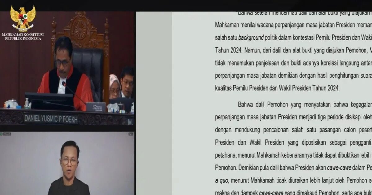 ศาลรัฐธรรมนูญมีคำวินิจฉัยว่า ไม่มีหลักฐานว่ามีการทุจริตกันอย่างเป็นระบบ หรือ อย่างกว้างขวางในการเลือกตั้งอินโดนีเซียเมื่อวันที่ 14 กุมภาพันธ์ที่ผ่านมา และไม่พบว่า ประธานาธิบดี หน่วยงานของรัฐและเจ้าหน้าที่ท้องถิ่นเข้าไปแทรกแซงการเลือกตั้งเพื่อเบี่ยงเบนการตัดสินใจของผู้มีสิทธิลงคะแนนเสียงเลือกตั้ง หัวหน้าผู้พิพากษา ซูฮาร์โตโย ประกาศคำพิพากษาว่า คำร้องของโจทก์ไม่มีหลักฐานทางกฎหมายทั้งหมด รายงานกล่าวว่า คณะผู้พิพากษาศาลรัฐธรรมนูญ 5 คน มีความเห็นให้ปฎิเสธคำร้อง ส่วนผู้พิพากษาอีก 3 คนมีความเห็นแย้ง