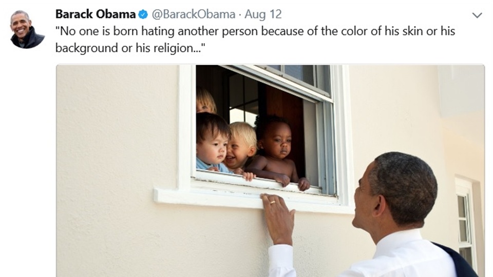 โอบามาทวีตเมื่อวันที่ 13 สิงหาคมว่า “ไม่มีใครเกิดมาเกลียดคนอื่นเพราะเรื่องของสีผิว ภูมิหลังหรือศาสนา” พร้อมกับภาพเขายืนอยู่นอกอาคารเกาะหน้าต่างทักทายเด็กเล็ก ๆ ในอาคาร เป็นเด็กที่มีความหลากหลายทางเชื้อชาติและสีผิว ประโยคดังกล่าวเป็นประโยคที่อดีตประธานาธิบดีเนลสัน แมนเดลา ผู้นำผิวดำคนแรกของแอฟริกาใต้เคยกล่าวไว้ มีคนกดหัวใจแสดงความถูกใจทวีตนี้แล้ว 2.4 ล้านครั้งและรีทวีตแล้ว 1 ล้านครั้ง นับจนถึงช่วงบ่ายวันนี้ตามเวลาในไทย โอบามายังได้ทวีตอีก 2 ประโยคที่อ้างจากคำกล่าวของแมนเดลาว่า “การจะเกลียดใครต้องเกิดจากการเรียนรู้ หากเรียนรู้ที่จะเกลียดได้ ก็ถูกสอนให้รักได้เช่นกัน” และ “เพราะความรักจะส่งถึงจิตใจมนุษย์ได้อย่างเป็นธรรมชาติมากกว่าความเกลียด”