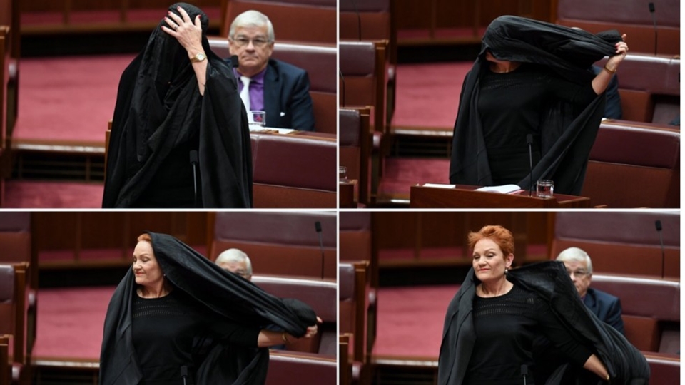 นางแฮนสัน หัวหน้าพรรควันเนชัน สวมบุรกาสีดำเข้าไปนั่งในที่นั่งของตัวเองอยู่ 20 นาที แล้วถอดออกพร้อมกับเรียกร้องให้ห้ามการแต่งกายแบบนี้ในที่สาธารณะเพื่อความปลอดภัยของประเทศ เธอกล่าวต่อที่ประชุมวุฒิสภาว่า ในเมื่อผู้สวมหมวกเหล็กหรือหมวกนิรภัยจะต้องถอดออกก่อนเข้าไปในธนาคารและสถานที่สาธารณะต่าง ๆ ผู้สวมชุดคลุมทั้งตัวและใบหน้าแบบนี้ก็ต้องถอดออกเช่นกัน
