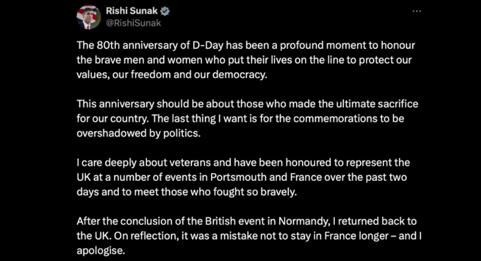 นายซูแน็ก โพสต์ข้อความผ่านทางแอปพลิเคชั่นเอ็กซ์ หรือ ทวิตเตอร์เดิมว่า หลังจากที่เสร็จสิ้นพิธีในส่วนของอังกฤษที่เมืองนอร์มังดี เขาก็เดินทางกลับอังกฤษในทันที แต่จากเสียงสะท้อนของหลาย ๆ ฝ่ายแล้ว ถือว่าเป็นความผิดพลาดที่เขาไม่ได้อยู่ในฝรั่งเศสให้นานกว่านี้ ซึ่งเขาต้องขอโทษด้วย นายซูแน็ก กำลังหาเสียงเลือกตั้งอย่างหนักเพื่อให้ได้เสียงสนับสนุนจากประชาชนก่อนการเลือกตั้งทั่วไปในวันที่ 4 กรกฎาคมนี้ ซึ่งพรรคอนุรักษ์นิยมของเขามีคะแนนนิยมตามหลังพรรคแรงงาน ซึ่งเป็นพรรคฝ่ายค้านอยู่ในขณะนี้
