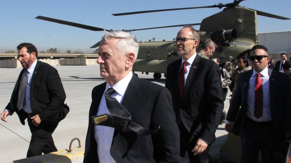 พล.อ. แมททิสมีกำหนดเข้าพบปะกับนายกรัฐมนตรีไฮเดอร์ อัลอาบาดีและเจ้าหน้าที่ระดับสูงคนอื่นๆ รวมถึงนายมาซูด บาร์ซานี ผู้นำเขตปกครองตนเองเคอร์ดิสถาน เพื่อหารือการกำจัดนักรบจีฮัดของกลุ่มไอเอสในอิรัก พล.อ. แมททิสกล่าวกับผู้สื่อข่าวก่อนออกเดินทางไปยังกรุงแบกแดดว่า สหรัฐขณะนี้ให้ความสำคัญกับการจัดการกลุ่มไอซิส ซึ่งเป็นชื่อที่สหรัฐใช้เรียกกลุ่มไอเอส รวมถึงฟื้นฟูอธิปไตยและบูรณภาพแห่งดินแดนของอิรัก