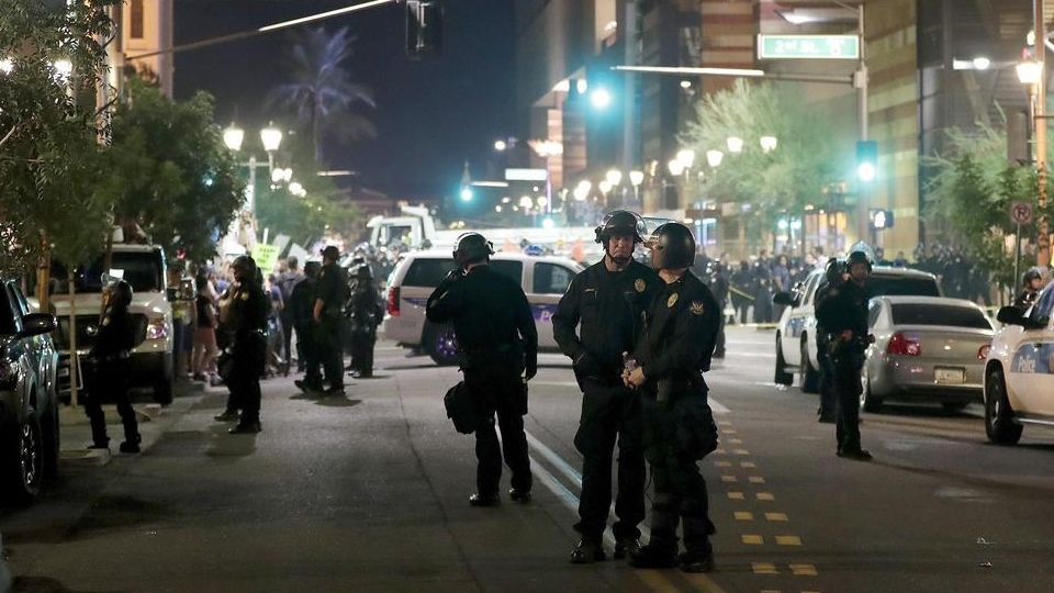 โฆษกสำนักงานตำรวจเมืองฟีนิกซ์รายงานว่า ฝูงชนเริ่มปาก้อนหินและขวดน้ำเข้าใส่ตำรวจ ทำให้ต้องใช้แก๊สและสเปรย์พริกไทยเข้าสลายผู้ชุมนุมในวันอังคารตามเวลาท้องถิ่น เพื่อพยายามสลายกลุ่มผู้ประท้วงและสกัดไม่ให้ใช้ความรุนแรง อย่างไรก็ตามตำรวจไม่ได้ประเมินตัวเลขกลุ่มผู้ประท้วงที่ออกมาในครั้งนี้ แต่สื่อรัฐแอริโซนารายงานว่า มีจำนวนหลายพันคน และสื่อรายงานว่า กลุ่มผู้ประท้วงขว้างปาขวดน้ำเข้าใส่ตำรวจ .- สำนักข่าวไทย