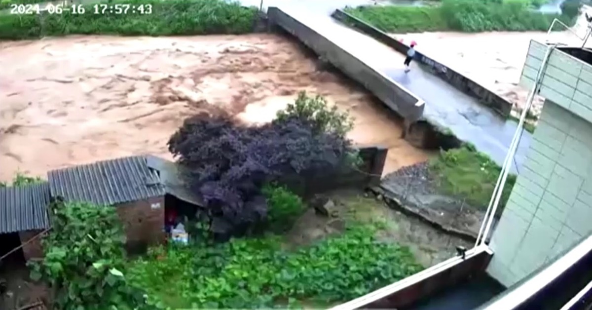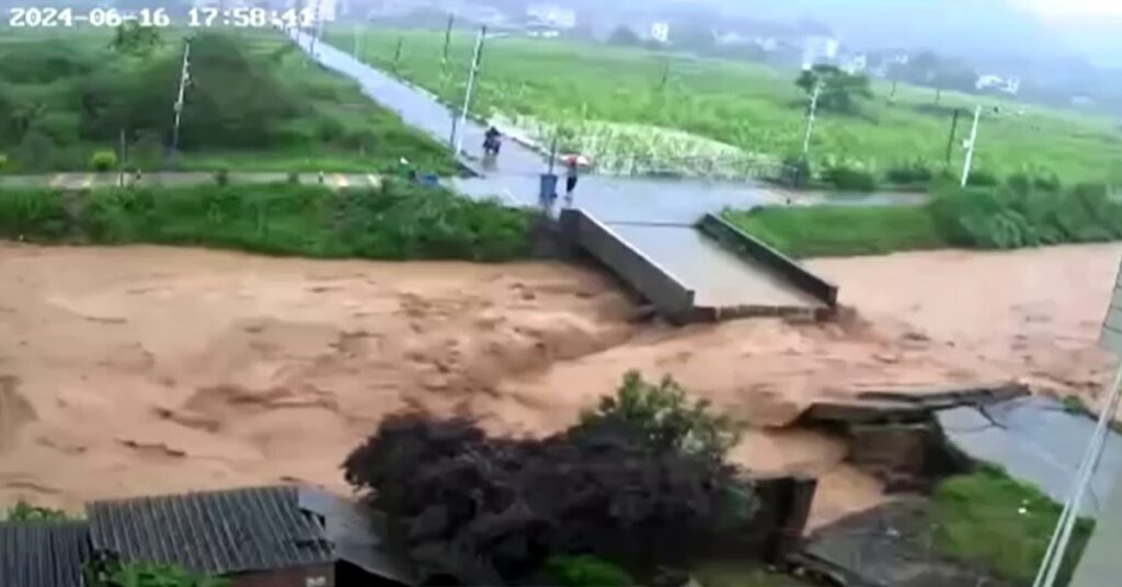 ภาพจากกล้องวงจรปิดเห็นชายคนหนึ่งเดินกางร่มข้ามสะพานขนาดเล็กในเมืองเม่ยโจว มณฑลกวางตุ้ง เมื่อวันอาทิตย์ที่ผ่านมา โดยมีกระแสน้ำสีขุ่นไหลเชี่ยวอยู่ใต้สะพาน เนื่องจากมีฝนตกหนักในพื้นที่ต่อเนื่องหลายวัน เขาเดินข้ามสะพานไปเพื่อลากถังขยะกลับมาอีกฝั่ง แต่ในช่วงที่กำลังจะเดินข้ามขากลับ โครงสร้างสะพานก็พังถล่มลงไปต่อหน้าต่อหน้า เพราะต้านความรุนแรงของกระแสน้ำเชี่ยวกรากที่ไหลผ่านสะพานไม่ไหว ทำให้รอดชีวิตอย่างหวุดหวิด