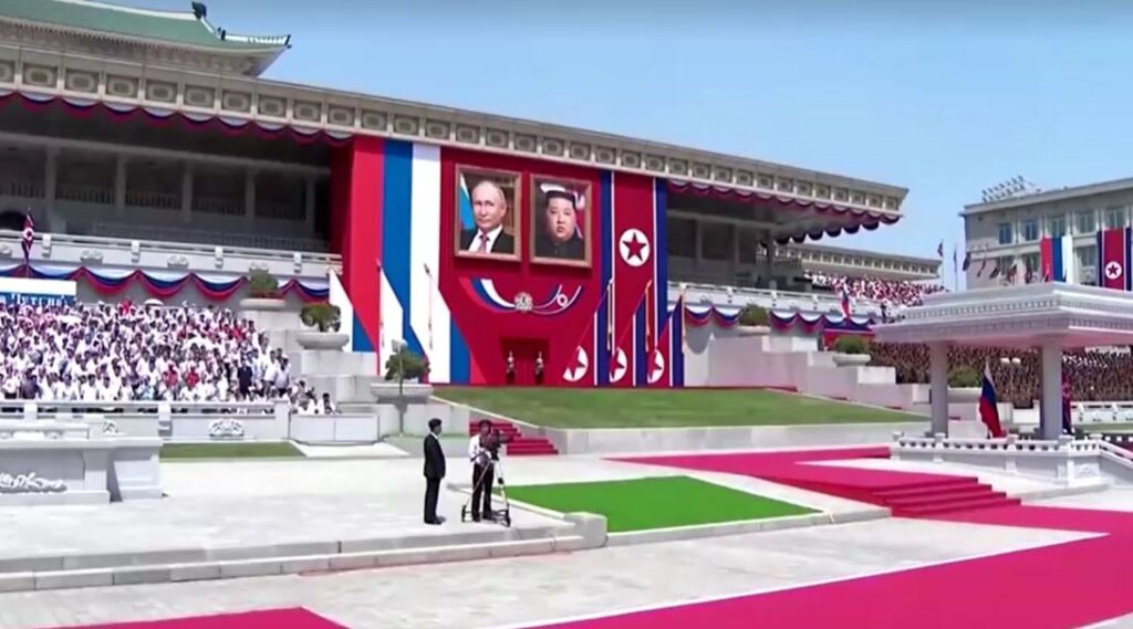 เกาหลีเหนือจัดขบวนพาเหรดและการสวนสนามอย่างยิ่งใหญ่ที่จัตุรัสคิม อิล-ซุง ในกรุงเปียงยาง โดยมีประชาชนชาวเกาหลีเหนือร่วมให้การต้อนรับด้วยการโห่ร้องยินดี หลังจากนั้นผู้นำทั้งสองได้ร่วมประชุมหารือกันที่พระราชวังคุมซูซัน รัฐบาลของทั้ง 2 ประเทศเผยว่า จะมีการหารือด้านความร่วมมือทางยุทธศาสตร์เพื่อให้สอดคล้องกับสถานการณ์โลก ด้วยจุดยืนสร้างระเบียบโลกใหม่แบบพหุนิยมหลายขั้วอำนาจ และสกัดกั้นอำนาจและอิทธิพลของชาติตะวันตก