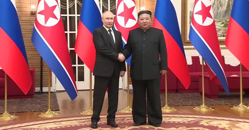 เปียงยาง 19 มิ.ย.- นาย คิม จอง-อืน ผู้นำสูงสุดของเกาหลีเหนือ ได้จัดพิธีต้อนรับนาย วลาดิเมียร์ ปูติน ประธานาธิบดีรัสเซียที่เดินทางไปเยือนเป็นครั้งแรกในรอบ 24 ปี อย่างยิ่งใหญ่