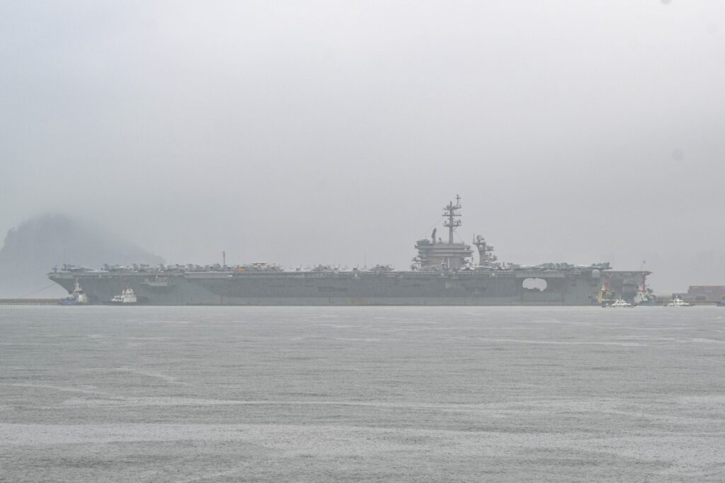 ยอนฮัพรายงานอ้างแถลงการณ์ของกองทัพเรือที่ระบุว่า เรือบรรทุกเครื่องบินสหรัฐเดินทางมาถึงท่าเรือของกองทัพเรือเกาหลีใต้ที่เมืองปูซาน ซึ่งอยู่ห่างจากกรุงโซลไปทางตะวันออกเฉียงใต้ 320 กิโลเมตร เมื่อตอนเช้าตรู่วันเสาร์ พร้อมด้วยเรือติดตาม 2 ลำได้แก่ เรือพิฆาตยูเอสเอส ฮัลซีย์และเรือยูเอสเอสแดเนียล อินูเย ครั้งนี้นับเป็นครั้งแรกในรอบ 7 เดือนที่เรือบรรทุกเครื่องบินสหรัฐมาเยือนเกาหลีใต้ หลังจากที่เรื่องบรรทุกเครื่องบินยูเอสเอส คาร์ล วินสัน มาเยือนเมื่อเดือนพฤศจิกายนปีที่แล้ว นอกจากนั้นยังเป็นครั้งแรกที่เรือยูเอสเอส ธีโอดอร์ รูสเวลล์ มาเยือนเมืองปูซาน