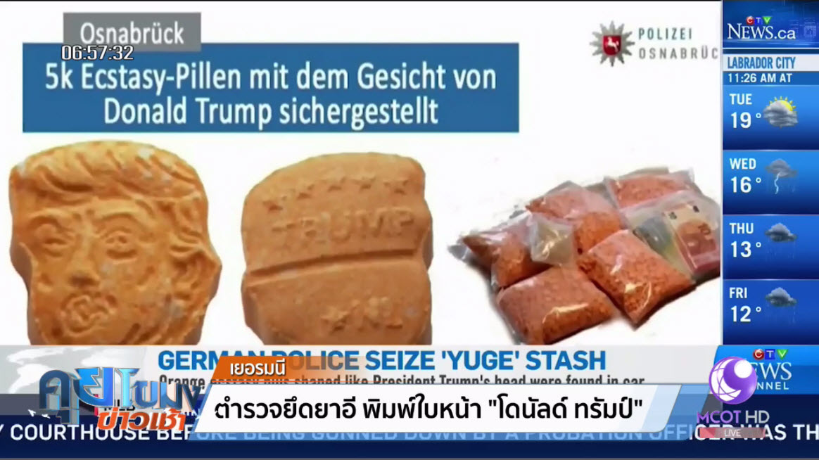 ตำรวจเยอรมนีรวบตัวพ่อค้ายาเสพติดได้ที่เมืองออสนาบรูค รัฐโลเวอร์ แซกโซนี ทางตะวันตกเฉียงเหนือของประเทศ และตรวจค้นในรถยนต์ พบยาอีประมาณ 5,000 เม็ด เมื่อตรวจสอบยาอีที่ยึดมาได้ พบว่ายาอีชุดนี้ปั๊มลายเป็นรูปใบหน้าประธานาธิบดีโดนัลด์ ทรัมป์ ผู้นำสหรัฐ พร้อมทรงผมอันเป็นเอกลักษณ์ที่ด้านหน้า ส่วนเม็ดยาด้านหลังพิมพ์ชื่อ Trump พร้อมเงินสดอีกจำนวนหนึ่ง รวมมูลค่ายาอีที่ยึดได้สูงถึง 11,000 ยูโร หรือราว 429,000 บาท แต่ถ้านำไปขายในตลาดมืดจะมีมูลค่าขยับไปอยู่ที่ 39,000 ยูโร หรือกว่า 1.5 ล้านบาท สำหรับผู้ต้องสัยค้ายาอีทั้งสองคนที่รวบตัวมาได้นั้น เป็นชายชาวออสเตรียวัย 51 ปี และลูกชายวัย 17 ปี ตอนนี้ถูกตำรวจควบคุมตัวเพื่อดำเนินคดีต่อไป.-สำนักข่าวไทย