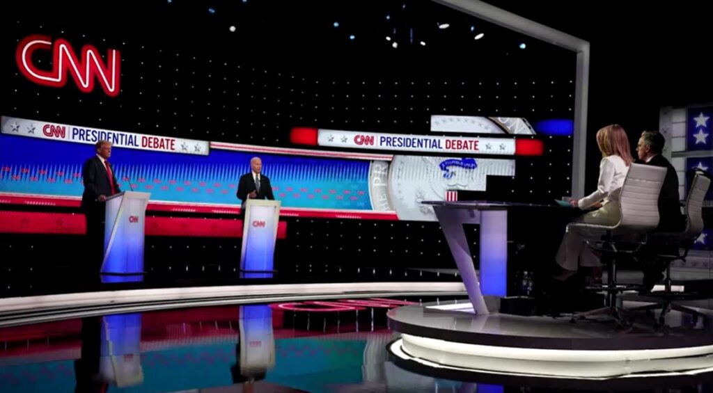 การโต้วาทีเริ่มขึ้นตั้งแต่เวลา 21.00 น.วันพฤหัสบดีตามเวลาตะวันออกสหรัฐ ตรงกับเวลา 08.00 น.วันนี้ตามเวลาในไทย โดยมีการถ่ายทอดสดทางสถานีโทรทัศน์ซีเอ็นเอ็น (CNN) ซึ่งเป็นเจ้าภาพการดีเบตในห้องส่งที่ไม่มีผู้ชม ไบเดน วัย 81 ปี เดินไปยืนที่แท่นพูดด้านขวาของเวที จากนั้นทรัมป์ วัย 78 ปี เดินไปยืนที่แท่นพูดด้านซ้ายของเวที โดยที่ทั้งคู่ไม่มีการจับมือกัน
