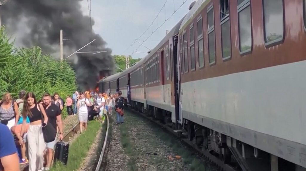 ภาพเหตุการณ์จากคลิปวีดีโอที่ถ่ายโดยหนึ่งในผู้โดยสารรถไฟหลังจากอพยพออกจากรถไฟ แสดงให้เห็นผู้โดยสารกำลังเดินไปตามรางรถไฟ พร้อมกระเป๋าสัมภาระ ขณะที่มีกลุ่มควันที่เกิดจากการชนกันระหว่างขบวนรถไฟกับรถบัสลอยเป็นฉากหลัง