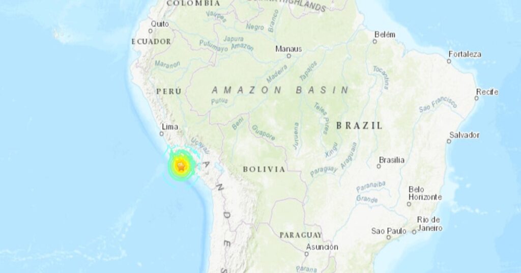 ด้านเว็บไซต์สำนักสำรวจธรณีวิทยาของสหรัฐหรือยูเอสจีเอส (USGS) รายงานว่า เกิดแผ่นดินไหวขนาด 7.2 เมื่อเวลา 05.36 น.วันนี้ตามเวลามาตรฐานสากล ตรงกับเวลา 12.36 น.วันนี้ตามเวลาไทย ห่างจากเมืองอาติกีปาของเปรูไปทางตะวันตก 8 กิโลเมตร ศูนย์กลางแผ่นดินไหวลึกลงไปในทะเล 28 กิโลเมตร.-814.-สำนักข่าวไทย