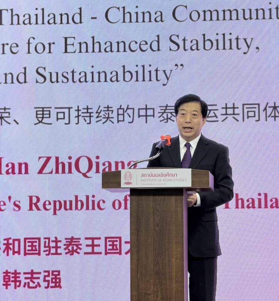 ในโอกาสนี้ ฯพณฯ หาน จื้อเฉียง เอกอัครราชทูตสาธารณรัฐประชาชนจีนประจำประเทศไทย ได้กล่าวชื่นชมและแสดงความยินดีกับงานวิจัยซึ่งดำเนินการโดยศูนย์จีนศึกษา สถาบันเอเชียศึกษา จุฬาลงกรณ์มหาวิทยาลัย พร้อมทั้งย้ำว่า จีนมีแนวคิดในการร่วมสร้างประชาคมที่มีอนาคตร่วมกันของมนุษยชาติ โดยยึดหลักความไว้เนื้อเชื่อใจ เกื้อกูลซึ่งกันและกัน และตั้งอยู่บนพื้นฐานความเป็นจริงและความเสมอภาค สอดคล้องกับแนวคิดแห่งสันติภาพ เพื่อโลกใหม่ที่มีสันติภาพและก้าวหน้า จีน-ไทยมีผลประโยชน์ร่วมกันในกิจการระหว่างประเทศทั้งในระดับโลกและภูมิภาค การกระชับความสัมพันธ์ ร่วมมือกัน เพื่อสร้างประชาคมที่มีอนาคตร่วมกัน จึงเป็นสิ่งสำคัญที่จะนำประโยชน์สูงสุดมาสู่ประเทศและประชาชน