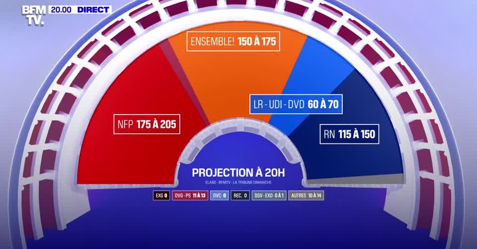 อย่างไรก็ดี ผลโพลสำรวจคะแนนนอกคูหาเลือกตั้ง หรือเอ็กซิตโพล ที่จัดทำโดยสำนักจัดทำโพลหลายแห่งให้กับหลายสื่อในฝรั่งเศสชี้ไปในทางเดียวกันว่า นิวป็อปปูลาร์ฟรอนต์ (New Popular Front) หรือเอ็นเอฟพี (NFP) ซึ่งเป็นกลุ่มพันธมิตรฝ่ายซ้าย น่าจะชนะเลือกตั้งได้เก้าอี้สมาชิกสมัชชาแห่งชาติ หรือ สส.มากที่นั่งที่สุดแบบคาดไม่ถึง แม้จะไม่ได้ถึงเกณฑ์เสียงข้างมากเด็ดขาด 289 ที่นั่ง จากทั้งหมด 577 ที่นั่ง ก็ตาม โดยน่าจะได้ที่นั่ง สส.ระหว่าง 184-198 ที่นั่ง ตามด้วยพรรคพันธมิตรสายกลางของประธานาธิบดีมาครง 160-169 ที่นั่ง พรรคอาร์เอ็นและพรรคพันธมิตร 135-143 ที่นั่ง