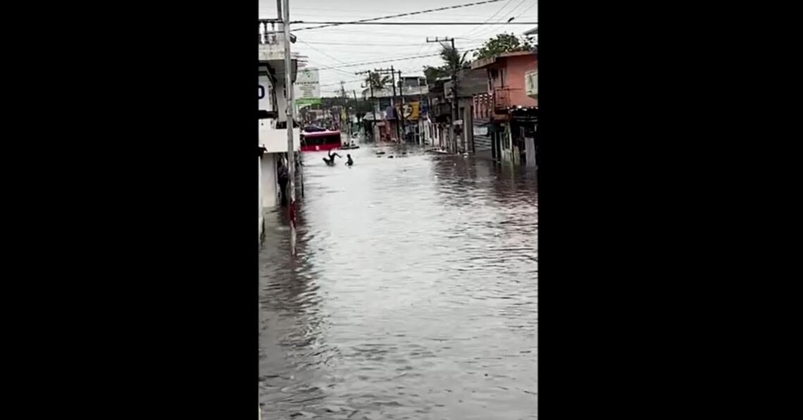เบรากรุซ 11 ก.ค.- ชาวบ้านในรัฐเบรากรุซ ทางภาคตะวันออกของเม็กซิโก เปลี่ยนท้องถนนที่ถูกน้ำท่วมให้กลายเป็นสนามเด็กเล่น ด้วยการเล่นกระโดดน้ำบนถนนที่แปรสภาพเป็นลำคลอง