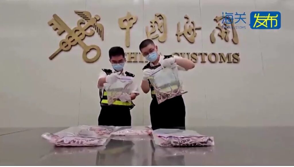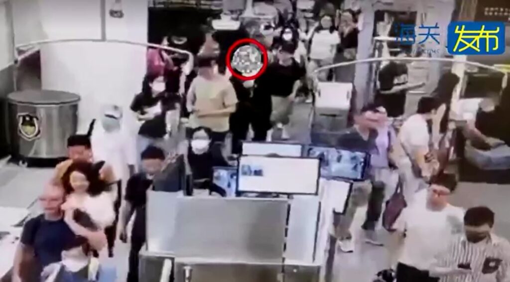 ศุลกากรจีนเปิดเผยภาพจากกล้องวงจรปิดที่บันทึกไว้เมื่อวันที่ 9 กรกฎาคม เห็นผู้ต้องสงสัยกำลังเดินผ่านช่องสำหรับผู้โดยสารที่ไม่มีสิ่งของต้องสำแดง ที่ท่าเรือฝูเถียน ซึ่งเป็นจุดผ่านแดนระหว่างจีนแผ่นดินใหญ่กับฮ่องกง ตั้งอยู่ในอำเภอฝูเถียนของเมืองเซินเจิ้น ขณะที่บัญชีเวยปั๋วของศุลากรจีนมีคำอธิบายภาพว่า เจ้าหน้าที่ได้ขอตรวจชายคนนี้ และพบถุงผ้า 6 ใบ ปิดผนึกด้วยเทปกาว ซุกซ่อนอยู่ในกระเป๋ากางเกงขายาวของเขา
