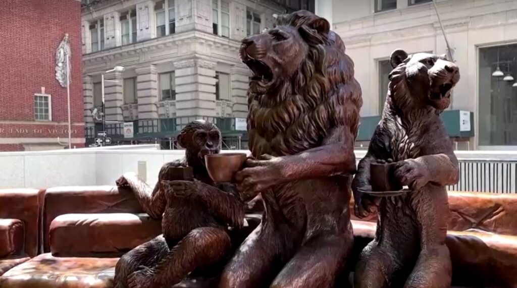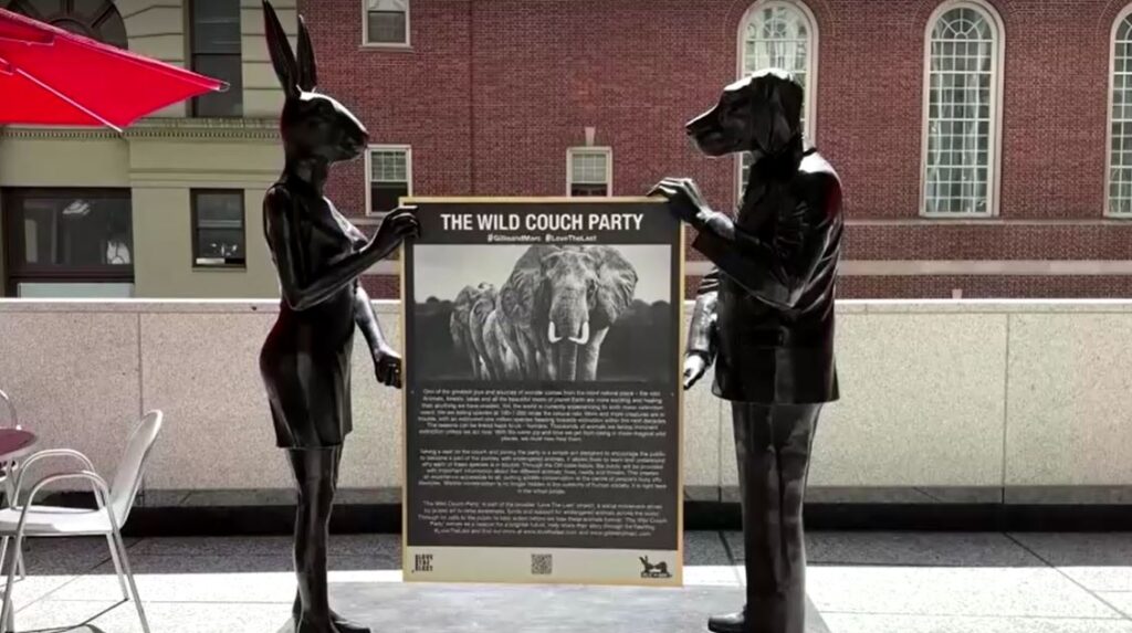 ผลงานประติมากรรมรูปหล่อสำริดที่มีชื่อว่า “THE WILD COUCH PARTY AND FRIENDS” เป็นผลงานการสร้างสรรค์ของ 2 ศิลปิน ชื่อกิลลีและมาร์ค แช็ตต์เนอร์ หล่อเป็นรูปสัตว์ชนิดต่าง ๆ นั่งอยู่บนโซฟายาวในลักษณะกำลังร่วมงานปาร์ตี้ โดยมีสัตว์ลูกผสมอย่างกระต่ายที่มีร่างกายเป็นผู้หญิง และสุนัขที่มีร่างกายเป็นผู้ชาย รับหน้าที่เป็นเจ้าภาพงานเลี้ยง ท่ามกลางแขกที่เป็นสัตว์น้อยใหญ่ 12 ตัว บางตัวถือถ้วยชาและกาแฟ บางตัวถือจานเค้ก หรือโดนัท