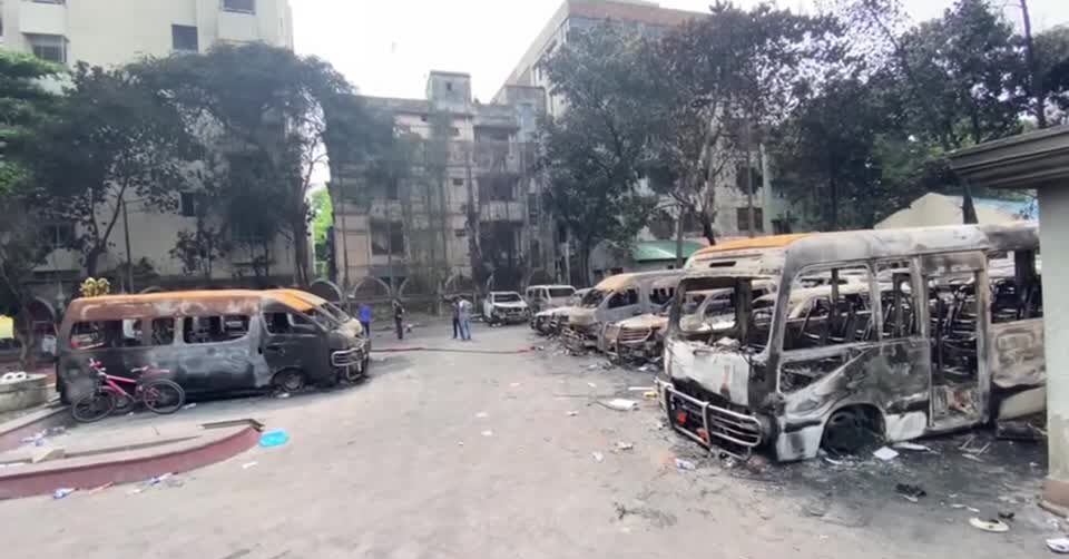ธากา 19 ก.ค. – สภาพในกรุงธากาของบังกลาเทศเต็มไปด้วยซากรถยนต์จำนวนมากที่ถูกไฟเผาตามท้องถนน ขณะที่อาคารหลายแห่งก็มีร่องรอยของการถูกวางเพลิง