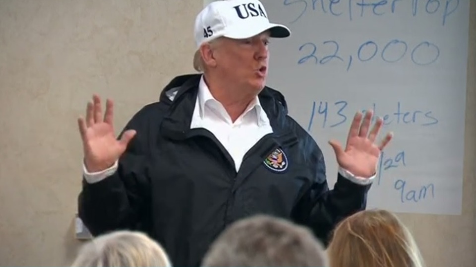 ประธานาธิบดีทรัมป์สวมหมวกเบสบอลมีคำว่า USA พร้อมกับชูธงประจำรัฐเทกซัสระหว่างเยี่ยมเมืองคอร์ปัส คริสตี พร้อมกับกล่าวชื่นชมเจ้าหน้าที่ทั้งระดับรัฐและรัฐบาลกลางที่รับมือภัยพิบัติอย่างแข็งขัน อย่างไรก็ดี เขาและนางเมลาเนีย ทรัมป์ สตรีหมายเลขหนึ่งยังไม่ลงพื้นที่เมืองฮิวสตัน เมืองใหญ่อันดับสี่ของประเทศที่ยังคงจมน้ำอยู่เพื่อไม่ให้กระทบต่อการทำงานของเจ้าหน้าที่ ทำเนียบขาวแจ้งว่า ประธานาธิบดีจะกลับไปเยี่ยมเทกซัสอีกครั้งในวันเสาร์นี้ ถือเป็นครั้งแรกที่ประธานาธิบดีสหรัฐกลับไปเยี่ยมพื้นที่ประสบภัยพิบัติในเวลาอันสั้น