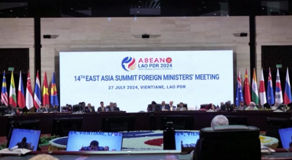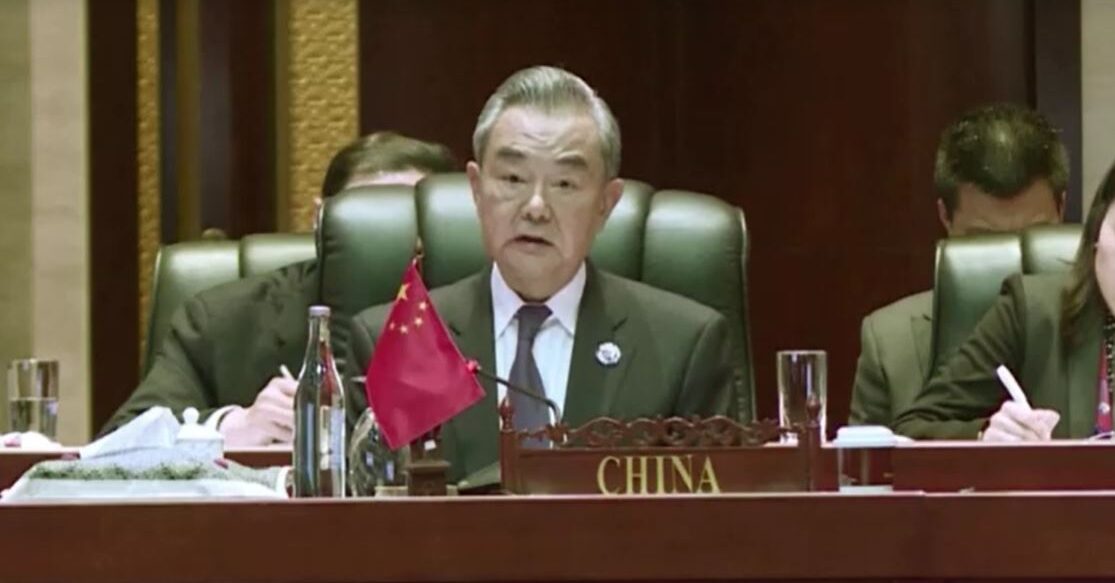 สถานีโทรทัศน์ซีซีทีวี (CCTV) ของทางการจีนรายงานว่า นายหวัง อี้ รัฐมนตรีต่างประเทศ ซึ่งเป็นกรรมการในกรมการเมืองของคณะกรรมาธิการกลางพรรคคอมมิวนิสต์จีนกล่าวปราศรัยต่อการประชุมรัฐมนตรีต่างประเทศการประชุมสุดยอดเอเชียตะวันออก หรืออีเอเอส (EAS) ครั้งที่ 14 ที่นครหลวงเวียงจันทน์ว่า สถานการณ์นานาชาติในขณะนี้เต็มไปด้วยความเปลี่ยนแปลงและความโกลาหล ประเด็นร้อนทวีความร้อนแรงและยากที่จะแก้ไข อีเอเอสจึงควรเดินในทิศทางที่ถูกต้อง ส่งเสริมความเป็นเอกภาพและความร่วมมือ ส่งเสริมสันติภาพและความรุ่งเรืองของภูมิภาคในระยะยาว และปกป้องความเป็นธรรมสากล