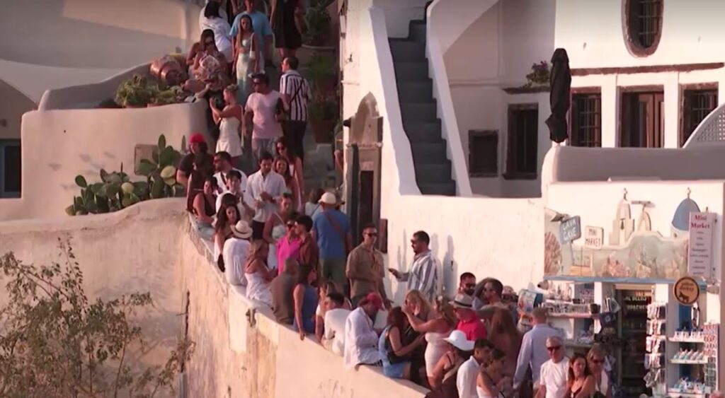 เกาะซันโตรินีอยู่ในทะเลอีเจียน ห่างจากแผ่นดินใหญ่ของกรีซไปทางตะวันออกเฉียงใต้ 200 กิโลเมตร มีพื้นที่เพียง 73 ตารางกิโลเมตร และมีผู้อาศัยอย่างถาวร 20,000 คน แต่เมื่อปีที่แล้วมีคนมาเยือนรวมกัน 3.4 ล้านคน เพิ่มแรงกดดันให้แก่สาธารณูปโภคที่ไม่พอรองรับ และทำให้ราคาที่อยู่อาศัยแพงขึ้น ชาวบ้านหลายคนติดป้ายขอให้ท่องเที่ยวอย่างเคารพเจ้าของบ้าน ทางการท้องถิ่นเรียกร้องให้รัฐบาลกลางสั่งจำกัดจำนวนผู้มาท่องเที่ยวด้วยเรือสำราญให้เหลือวันละ 8,000 คน จากปัจจุบันที่มีมากถึงวันละ 17,000 คน