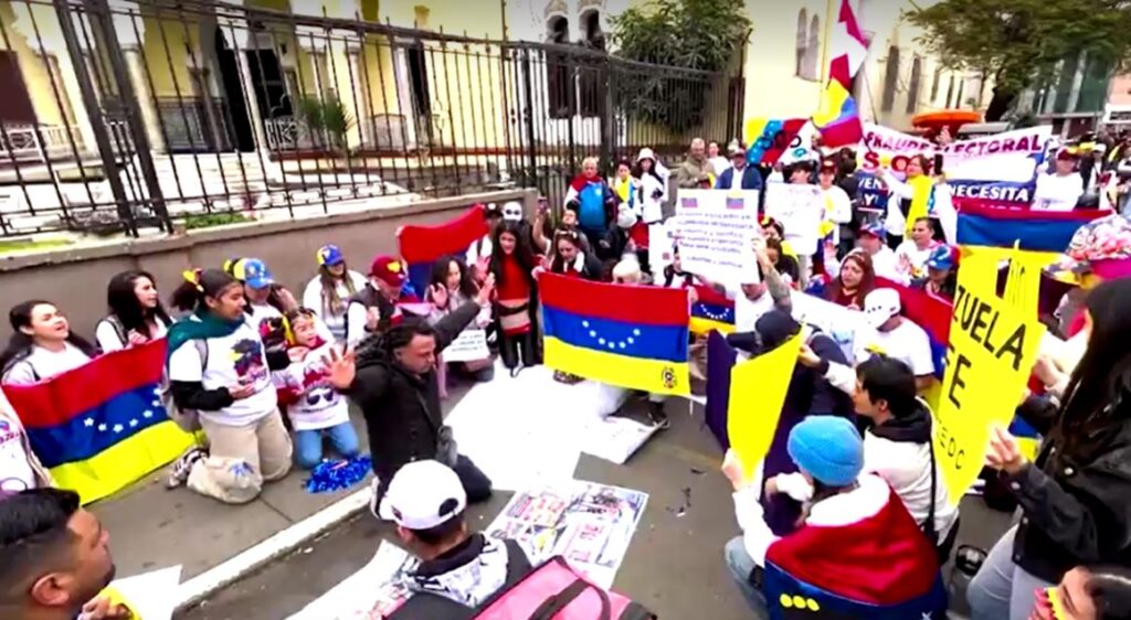 ด้านชาวเวเนซุเอลาในโคลอมเบียชุมนุมกันที่จัตุรัสซีมอนโบลิวาร์ในกรุงโบโกตา ตะโกนคำขวัญและเรียกร้องให้นานาติเข้าแทรกแซงเพื่อปกป้องประชาธิปไตยในเวเนซุเอลา ขณะที่ชาวเวเนซุเอลาในเปรูชุมนุมสวดภาวนา ปกป้องคะแนนเสียงของพวกเขาที่หน้าสถานทูตเวเนซุเอลาในกรุงลิมา