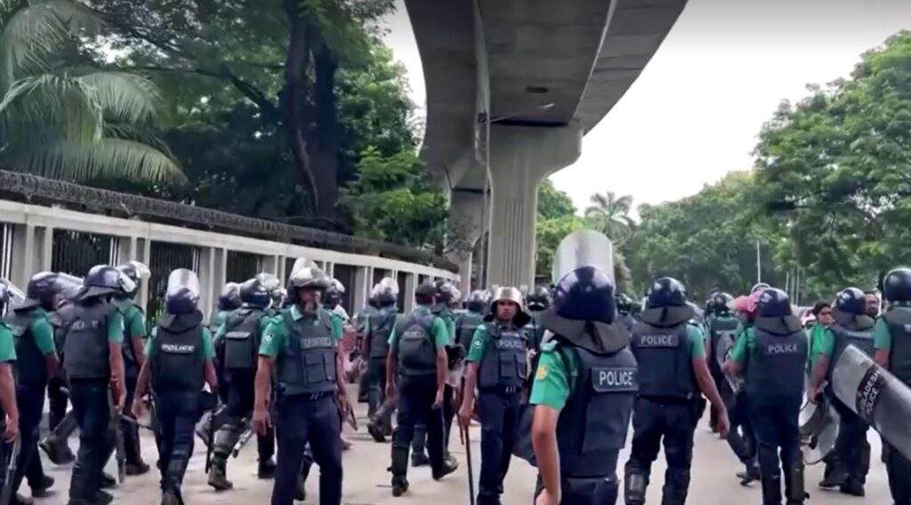 รถถังและรถตำรวจจอดประจำการตามท้องถนนในกรุงธากาที่อยู่ในสภาพตึงเครียดอย่างหนัก มีกำลังเจ้าหน้าที่เดินเท้าลาดตระเวนตามท้องถนน โดยแทบไม่มียวดยานของประชาชนสัญจร เนื่องจากทางการประกาศเคอร์ฟิวทั่วประเทศตั้งแต่เวลา 18.00 น.วันอาทิตย์ และประกาศวันหยุดราชการ 3 วันตั้งแต่วันจันทร์จนถึงวันพุธ การรถไฟบังกลาเทศแจ้งระงับการเดินรถไฟทั้งหมดอย่างไม่มีกำหนด เนื่องจากสถานการณ์ทวีความรุนแรง เช่นเดียวกับโรงงานสิ่งทอที่เป็นอุตสาหกรรมหลักของประเทศก็ประกาศปิดอย่างไม่มีกำหนด