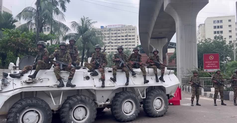 ด้านกองทัพบังกลาเทศแถลงเมื่อวันอาทิตย์ว่า จะปฏิบัติหน้าที่ตามรัฐธรรมนูญและกฎหมายของประเทศ ขอให้ประชาชนปฏิบัติตามเคอร์ฟิวและให้ความร่วมมือจนกว่าทุกอย่างจะยุติ ผู้บัญชาการทหารบกบังกลาเทศกล่าวว่า กองทัพจะอยู่เคียงข้างผลประโยชน์ของประชาชนและความต้องการของประเทศชาติเสมอ เขามีกำหนดแถลงข่าวต่อสื่อในวันนี้ แต่ได้ยกเลิกไปโดยไม่ได้ให้เหตุผล.-812(814).-สำนักข่าวไทย