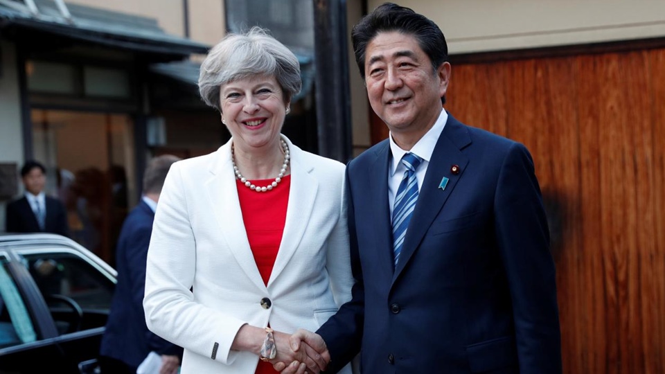 นางเมย์ได้พบกับนายกรัฐมนตรีชินโซ อาเบะของญี่ปุ่นระหว่างเยือนกรุงโตเกียว ขณะที่ญี่ปุ่นต้องรับมือกับภัยคุกคามทางทหารมากขึ้นจากเกาหลีเหนือ นายกรัฐมนตรีอังกฤษได้เยี่ยมชมเรือบรรทุกเฮลิคอปเตอร์อิซูโม เรือรบของญี่ปุ่น พร้อมกับพูดคุยเรื่องการทหารกับนายอิตซูโนริ โอโนเดระ รัฐมนตรีกระทรวงป้องกันประเทศของญี่ปุ่นก่อนเข้าร่วมการประชุมด้านความมั่นคงแห่งชาติ นายกรัฐมนตรีอังกฤษและญี่ปุ่นจะเห็นพ้องในแถลงการณ์ร่วมด้านความมั่นคง ซึ่งรวมถึงแผนการที่จะส่งทหารอังกฤษเข้าร่วมในปฏิบัติการซ้อมรบทางทหารบนดินแดนญี่ปุ่น เพื่อรับมือกับภัยคุกคามทางไซเบอร์และจากการโจมตีของกลุ่มติดอาวุธในช่วงที่ญี่ปุ่นเป็นเจ้าภาพจัดการแข่งขันกีฬาโอลิมปิก 2020 คาดว่าทั้งสองจะได้หารือแนวโน้มมาตรการคว่ำบาตรเกาหลีเหนือเพิ่มเติม