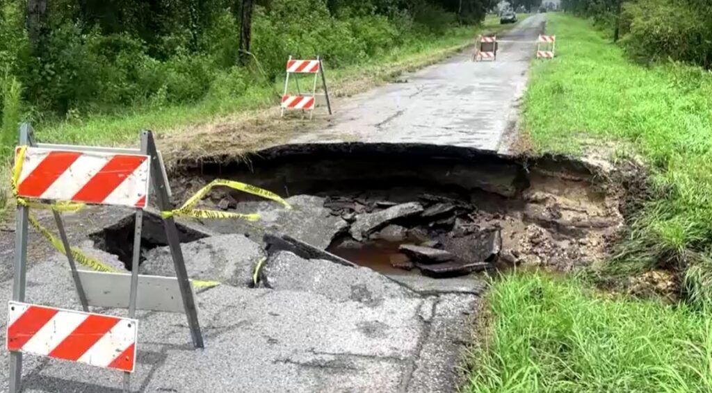ฟลอริดา 6 ส.ค.- ท้องถนนในหลายพื้นที่ของรัฐฟลอริดาของสหรัฐกลายสภาพเป็นลำคลองและทรุดตัวใช้สัญจรไม่ได้ หลังจากพายุโซนร้อนเด็บบี (Debby) ทำให้เกิดฝนตกหนักทั่วพื้นที่ทางเหนือของรัฐ