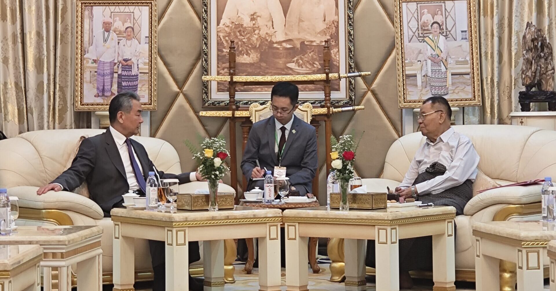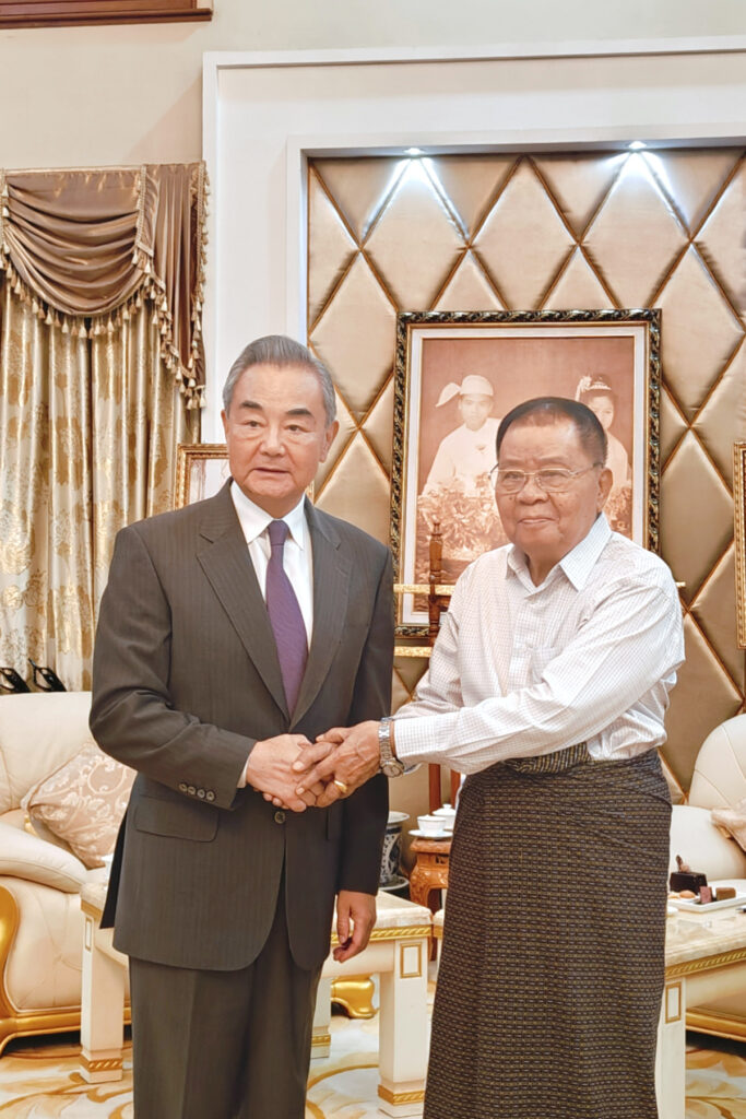 สำนักข่าวซินหัว ของทางการจีนรายงานว่า นายหวัง ซึ่งเป็นกรรมการกรมการเมืองแห่งคณะกรรมการกลางพรรคคอมมิวนิสต์จีน (ซีพีซี) ได้พบปะหารือกับนายตาน ฉ่วย อดีตประธานสภาสันติภาพและการพัฒนาแห่งรัฐของเมียนมา โดยหวังกล่าวว่าจีนคัดค้านการแทรกแซงและการแทรกซึมจากภายนอกในเมียนมา รวมถึงทุกคำพูดและการกระทำอันบ่อนทำลายเสถียรภาพและการพัฒนาของเมียนมา