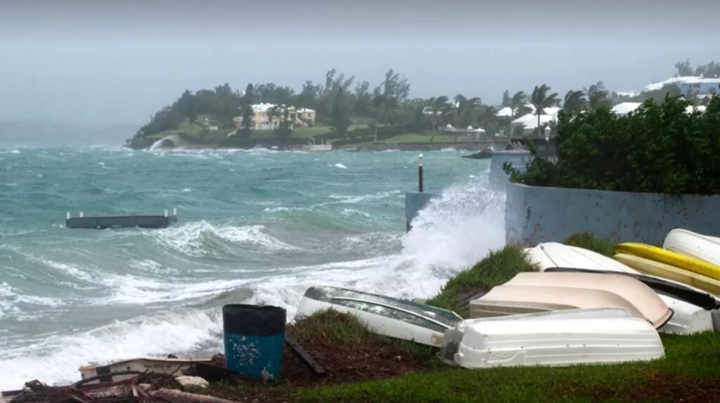ตาพายุของเฮอริเคนเคลื่อนตัวอย่างช้า ๆ ผ่านเบอร์มิวดา ที่เป็นดินแดนโพ้นทะเลของอังกฤษในมหาสมุทรแอตแลนติกเหนือเมื่อวันเสาร์ ทำให้เกิดลมพัดกระโชกแรง ต้นไม้กิ่งไม้หักโค่นกีดขวางการจราจร คลื่นยกตัวสูงซัดชายฝั่ง ประชาชนไม่มีไฟฟ้าใช้กว่าร้อยละ 70 ของผู้ใช้ไฟฟ้าทั่วเกาะ 36,000 ราย และทำให้เกิดฝนตกหนักที่อาจมีน้ำท่วมรุนแรงตามมา