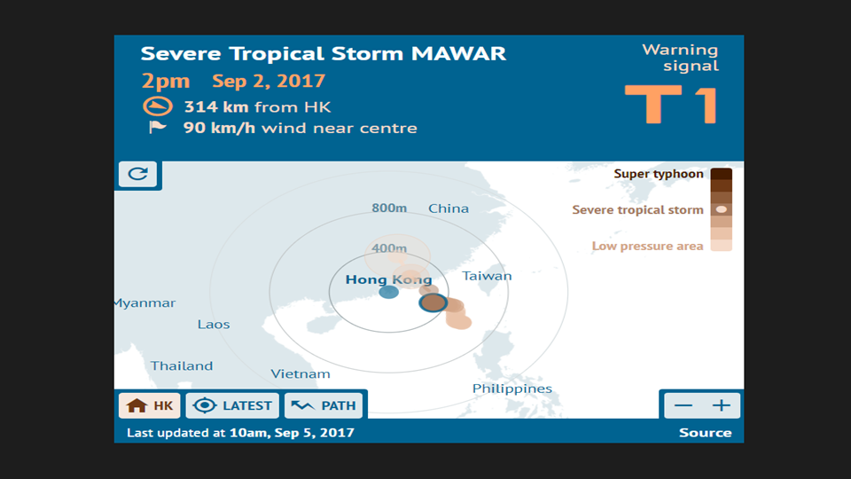 เว็บไซต์หนังสือพิมพ์เซาท์ไชนามอร์นิงโพสต์รายงานว่า สำนักอุตุนิยมวิทยาประกาศเตือนภัยระดับ 1 เมื่อเวลา 02.20 น.วันนี้ตามเวลาท้องถิ่น ตรงกับเวลา 01.20 น.วันนี้ตามเวลาในไทย และได้แจ้งล่าสุดเมื่อเวลา 11.45 น.ตามเวลาท้องถิ่นว่า พายุโซนร้อนมาวาร์เคลื่อนตัวห่างจากฮ่องกงไปทางตะวันออกค่อนตะวันออกเฉียงใต้ 320 กิโลเมตร คาดว่าจะมุ่งหน้าขึ้นเหนือค่อนตะวันตกเฉียงเหนือไปตามชายฝั่งตะวันออกของมณฑลกวางตุ้งก่อนขึ้นฝั่งในวันอาทิตย์ แต่ไม่น่าจะขึ้นฝั่งฮ่องกง หลังจากพยากรณ์เมื่อหลายวันก่อนว่าฮ่องกงอาจเผชิญพายุลูกที่ 3 ในรอบ 2 สัปดาห์ ต่อจากไต้ฝุ่นฮาโตะและพายุโซนร้อนปาข่า ขณะนี้พายุโซนร้อนมาวาร์กำลังเคลื่อนตัวอย่างช้า ๆ และมีกำลังแรงขึ้น แต่คงไม่ถึงกับทำให้ต้องยกระดับเตือนภัยเป็นระดับ 3