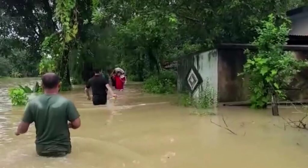 ชาวบังกลาเทศในอำเภอเฟนี ทางตะวันออกเฉียงใต้ของบังกลาเทศ ตัดต้นกล้วยทำเป็นแพเฉพาะกิจเพื่ออพยพกลุ่มคนเปราะบาง รวมทั้งเด็กทารก ด้วยการเดินฝ่าน้ำท่วมสูงระดับเอวออกจากชุมชนที่จมน้ำ ประชาชนหลายพันคนในอำเภอนี้ติดค้างตามบ้านเรือน เนื่องจากฝนฤดูมรสุมตกกระหน่ำไม่หยุด และมีน้ำท่วมเพราะน้ำล้นจากฝายกั้นแม่น้ำ หลายพื้นที่มีระดับน้ำสูงเกิน 12 ฟุต (เกิน 3.65 เมตร)
