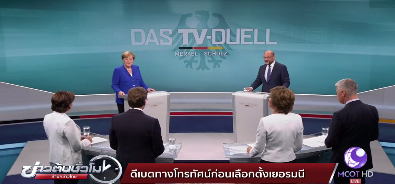 เยอรมนี 4 ก.ย.-นางอังเกลา แมร์เคิล นายกรัฐมนตรีหญิงของเยอรมนี โต้วาทีแสดงวิสัยทัศน์ทางโทรทัศน์กับนายมาร์ติน ชูลซ์ นักการเมืองกลางซ้าย และอดีตประธานสภายุโรป ก่อนการเลือกตั้งทั่วไปที่จะมีขึ้นในวันที่ 24 กันยายนนี้ โดยผลสำรวจล่าสุดของทุกสำนักพบว่าพรรคสังคมนิยมประชาธิปไตยของนายชูลซ์มีคะแนนนิยมตามหลังพรรคคริสเตียน เดโมแครต ของนางแมเคิล ที่พยายามจะชิงตำแหน่งผู้นำเยอรมนีเป็นสมัยที่ 4.-สำนักข่าวไทย