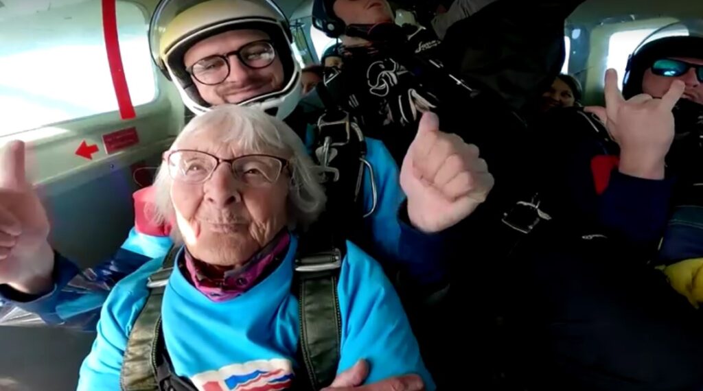 ลอนดอน 28 ส.ค.- ยายทวดชาวอังกฤษ วัย 102 ปี ฉลองวันคล้ายวันเกิด ด้วยการขึ้นเครื่องบินเล็กไปโดดร่มดิ่งพสุธา ลงถึงพื้นดินอย่างปลอดภัย